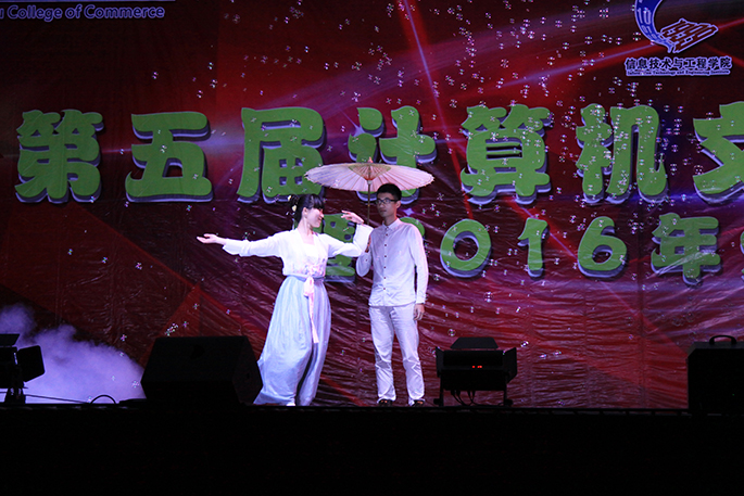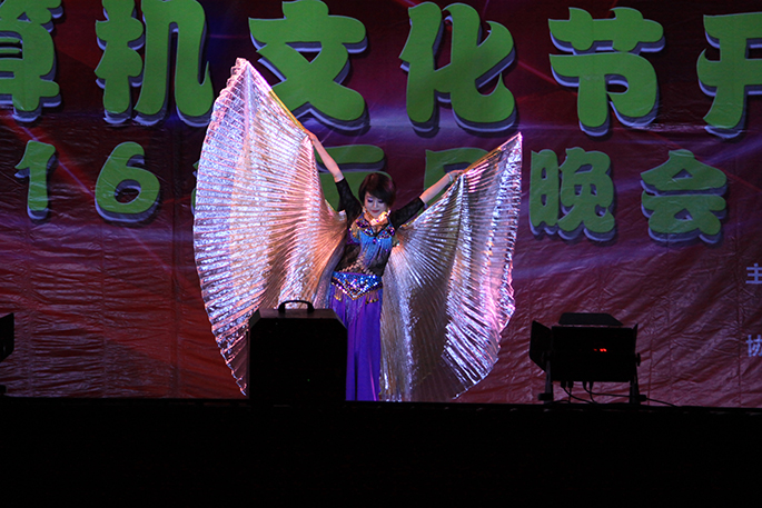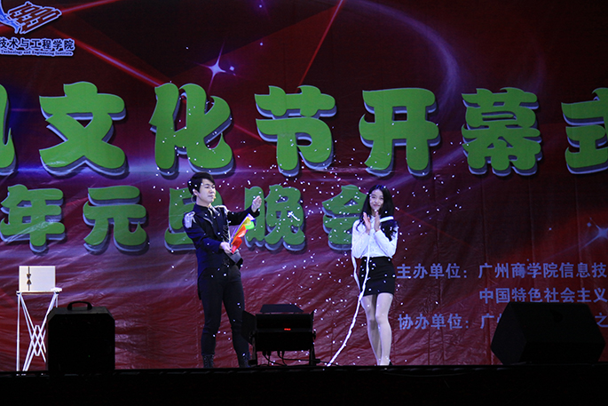 颁奖典礼过后,本场晚会的表演节目正式拉开序幕。当中,晚会由舞蹈、歌唱、话剧、魔术与抽奖环节穿插而成,表演者在绚丽的镁光灯下,舞动着一张张朝气蓬勃的笑脸,更是为在场观众带来了一场视听盛宴。譬如:由王鸾同学带来的魔术表演《Color change》,似把观众带入了一个神秘的魔术国度,看着纸张、布条、绳子在魔术师手中来无影、去无踪,同学们都禁不住拍案叫绝;信息公司杜云梅老师给大家带来舞蹈表演——《一千零一夜》,律动的乐章映衬着老师那曼妙的舞姿,在场的观众无法想象这是平日课堂上教书育人的辛勤园丁,纷纷为之惊叹;或是话剧表演《茶叶蛋的故事》,其演绎了一群个性张扬、活力四射的少年趣事,故事靓丽的色彩勾勒出大学的美景,也能感受到因正值青春而澎湃、跳动的心脏。