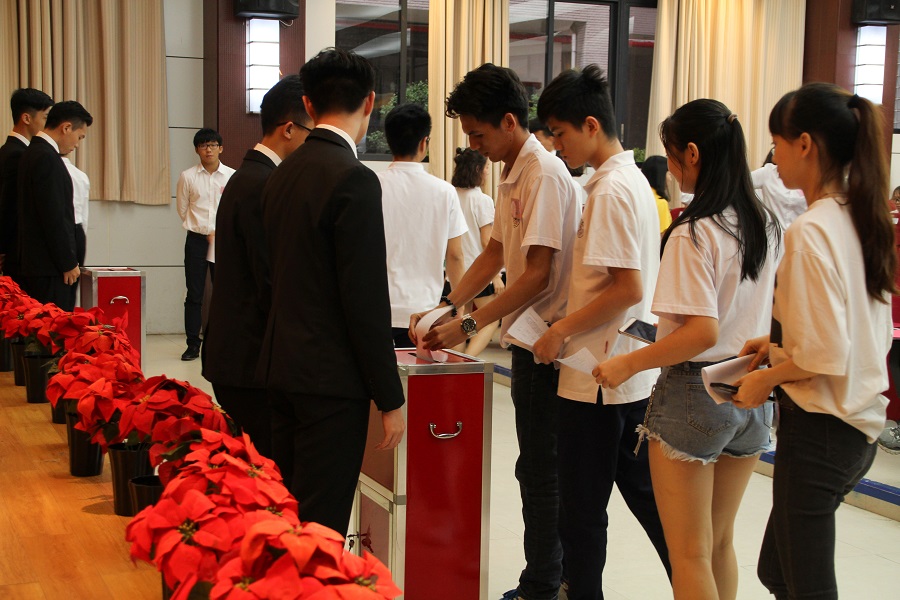 校员工会代表许锦添对本次大会发表召开意见后,15位委员候选人依次上台进行竞选演讲。经选举,大会产生了崔泽贤、陈思琼、胡舒娅、纪晓婷、李诗诗、梁琳、梁雪莹、龙浩、秦于雯、温嘉文、杨雨琴、郑点烁12位委员。