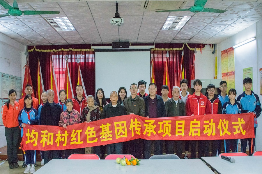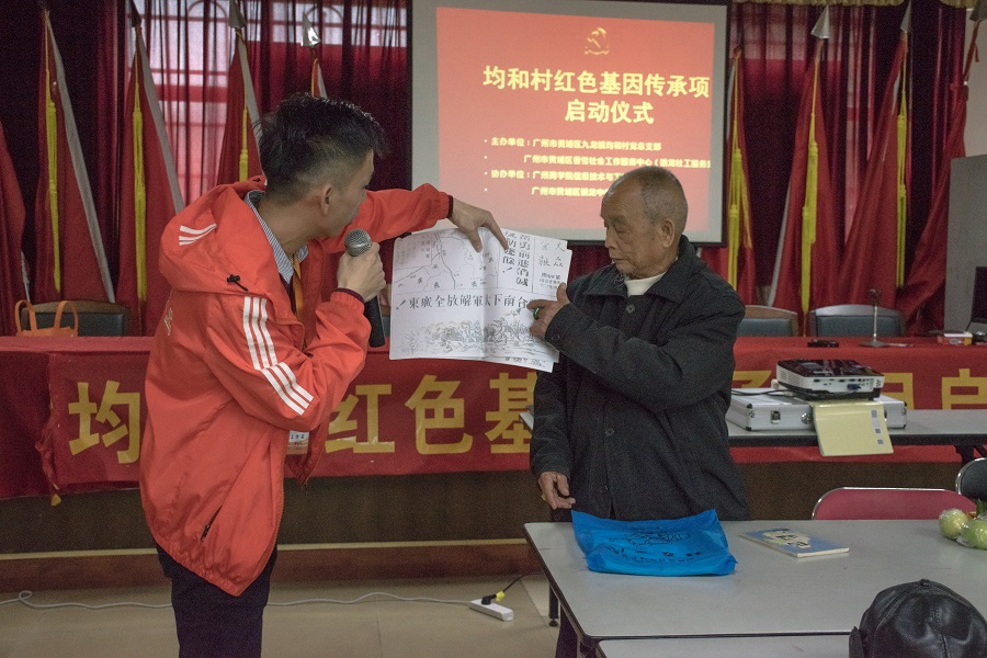 在启动仪式上,均和村党总支书记吴方仁向大家讲述了均和村浓厚的红色文化氛围,强调要整合优势,在文化和娱乐相融合的基础上弘扬和发展红色文化精神。镇龙社工服务站党建服务负责人陈笑群提倡体验式、互动式地学习红色文化精神,做到不忘初心,继往开来。镇龙中学代表陈文飞提出应响应党的十九大的号召,引领青少年不忘初心,传承红色革命基因,发扬优良的红色文化传统。党员义工代表罗建行提出了传承红色精神文化的重要性,号召大家积极参与本次“传承红色基因”的活动,尽己所能去服务社会。“e行动”志愿服务队队长郑庆佳表示志愿服务活动对当代老员工成长有着深远意义,号召广大新时代青年、奋斗者及追梦人要时刻铭记永垂不朽的红色文化、革命精神,要在实践与志愿服务中弘扬和发展这种精神,并由衷地期望“e行动”志愿服务队能帮助更多需要帮助的人。老红军代表吴胜有回忆起了他的抗战往事,用亲身印记细谈点点滴滴,并展示出“南下大军解放全广东”的地图,还当场动唱起了当时的军歌,台下的老红军也应声浅唱了起来,引人入境。