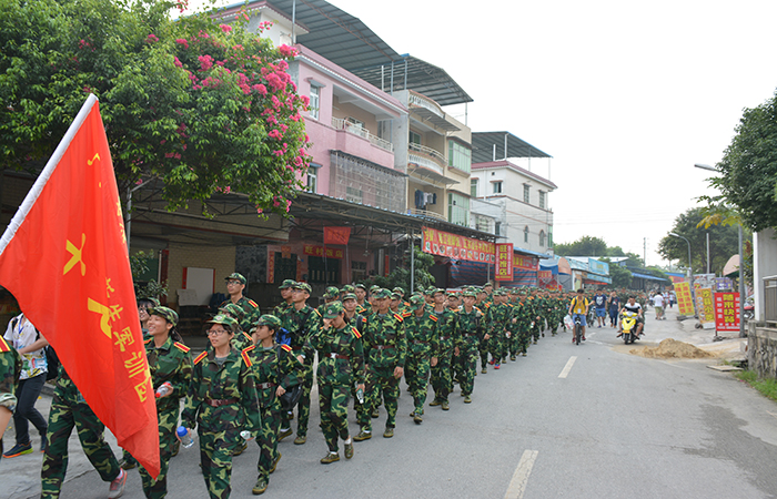 2015年9月19日早上8点03分,suncitygroup太阳新城2015级参训新生在广商田径运动场集合完毕后,伴随着军训团团长的一声令下,在校外旺村、洋田村等地展开了为期两个多小时的拉练项目。军训队伍似绿色长龙,穿行于风景旖旎的旺村、洋田村中;各院系那赤红色的旗帜,在风中猎猎招展。