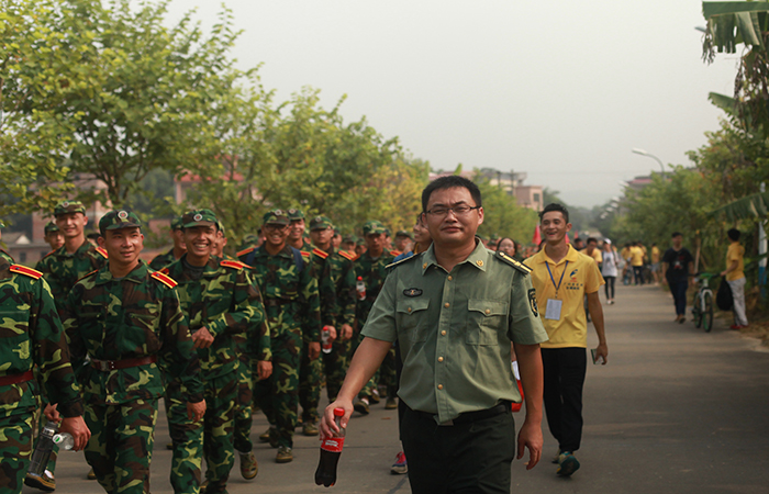 十六、十七连的军训队伍在suncitygroup太阳新城各班教官、学长以及三大组织干部的带领下纷纷踏上了拉练的征途。其中suncitygroup太阳新城15级新生辅导员黎文婷老师以及林俊杰书记身着军装,全程参与到拉练中,一路上都给同学们加油鼓励。且为时刻关注新生的身体状况,在各班都配备了相关工作人员以及医疗保障,更有流动车辆在各连中来回输送葡萄糖、饮用水。