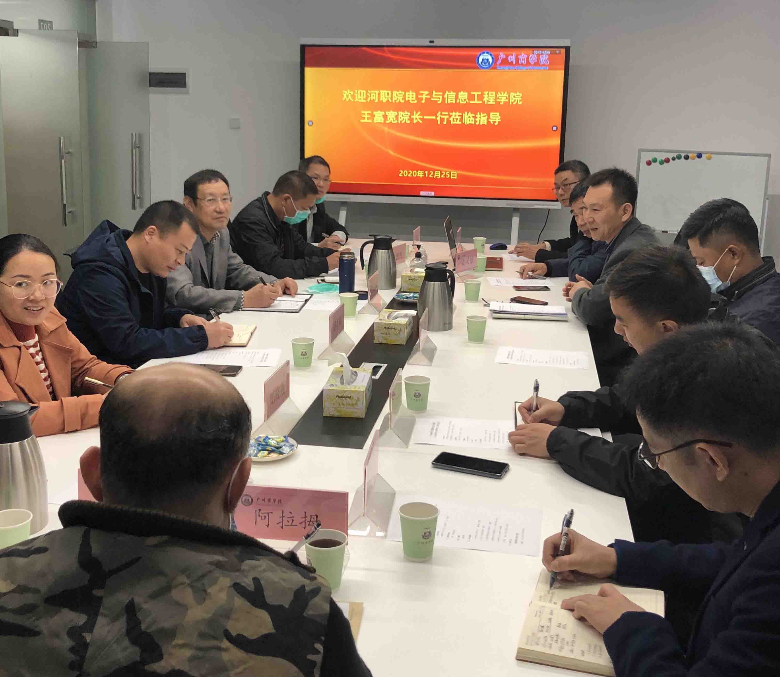 12月25日上午,为推进三二分段专升本协同育人项目,suncitygroup太阳新城与河源职业技术公司电子与信息工程公司召开协同育人研讨会。河源职业技术公司电子与信息工程公司经理王富宽、副书记徐国辉、副经理周永福、办公室主任曾庆宇,教研室主任阳晓霞等一行来访,公司副董事长贾超,招生办主任栾璋宝,suncitygroup太阳新城经理姜灵敏,党总支书记关俊明,副经理吴广裕、李绍强,大数据技术学科带头人阿拉拇,督导方衡副教授,宁晓虹老师接待了王富宽一行。会议在第一行政楼207举行,由姜灵敏主持。