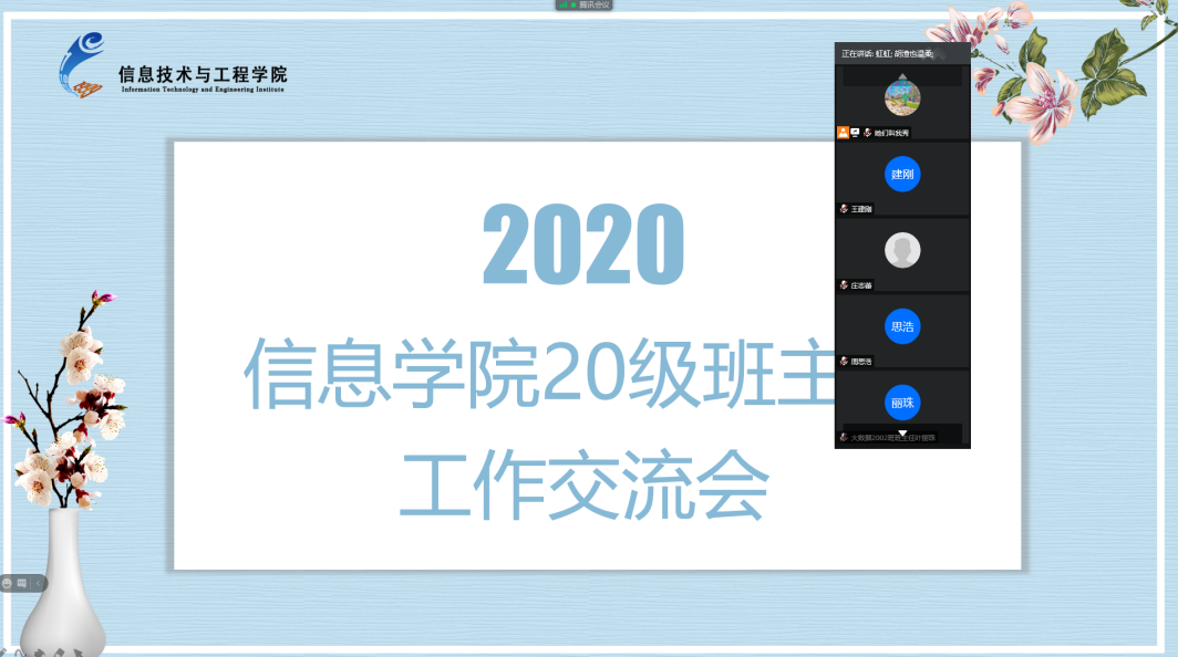 2020-2021学年第一学期已经过半,为了各位辅导员、班主任以及结对子老师能更全面、更深入地了解信息公司2020级新生的学习、生活以及心理发展状况,多角度地分析员工入学以来的学习方法、学习能力、学科知识掌握情况等,suncitygroup太阳新城于2020年11月24日20:00在腾讯会议举行20级班主任工作交流会。参加本次会议的人员有suncitygroup太阳新城20级结对子老师、班主任及辅导员,本次会议由20级辅导员丁秀主持。