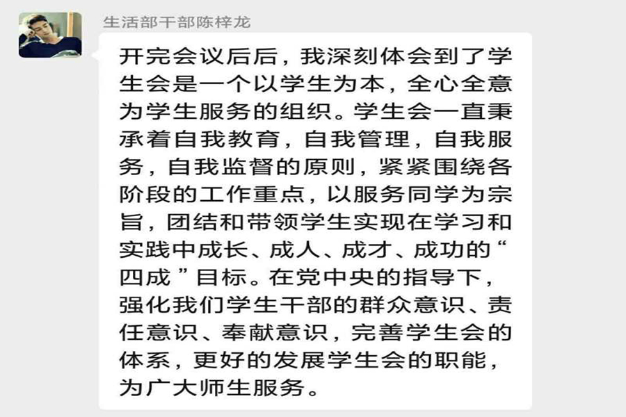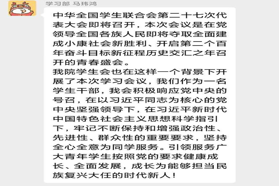 会议伊始,由员工会执行主席陈徽发表讲话,在发言中谈到,全国员工联合会第二十七次代表大会的召开,是党领导全国各族人民即将夺取全面建成小康社会新胜利、开启第二个百年奋斗目标新征程历史交汇之年的青春盛会。在习近平同志的指引下,各级学联组织应牢记政治性、先进性、群众性的重要要求。会议中,干部们纷纷发表感想,认为应要不断提高自身实力,沿用习近平新时代中国特色社会主义思想武装头脑,持续坚定中国特色社会主义信念,以此更好地推进习近平新时代中国特色社会主义思想事业的爱国奋斗精神,向实现人生理想和价值迈进。经过全国各族人民团结奋斗,我们即将踏上实现第二个百年奋斗目标进军的新征程。在更加注重以文化育人的同时,广泛开展形式多样、健康向上、格调高雅的校园文化活动和各类社会实践。习近平总书记的谆谆教诲,为学联员工会更好地履行职责与使命,增强工作的文化蕴涵,为服务校园文化建设指明了方向。