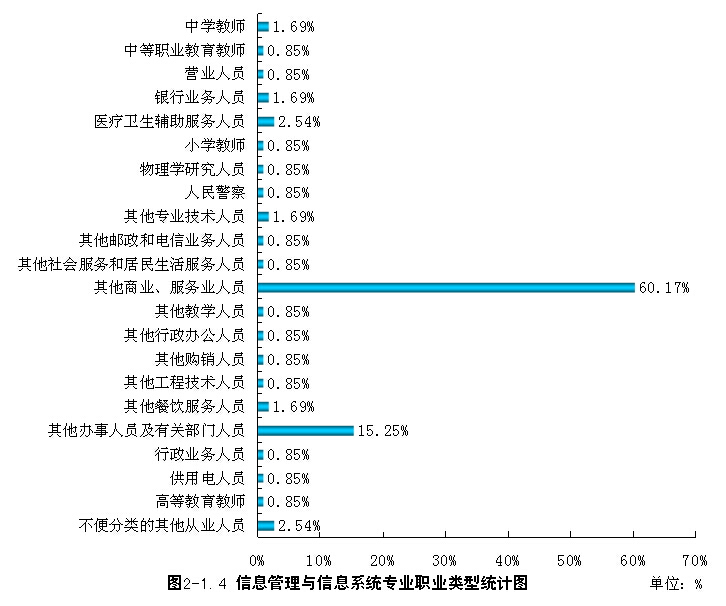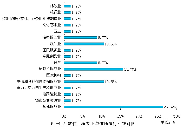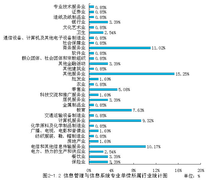 在就业行业里,其他服务业18人,商务服务业13人,电信和其他信息传输服务业12人,其中于计算机相关的行业电信和其他信息传输服务业12人、计算机服务业11人、科技交流和推广服务业2人、软件业1人,通信设备、计算机及其他电子设备制造业1人、专业技术服务业1人,共26人,占就业人数的22.03%。