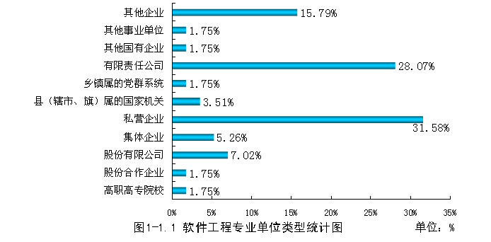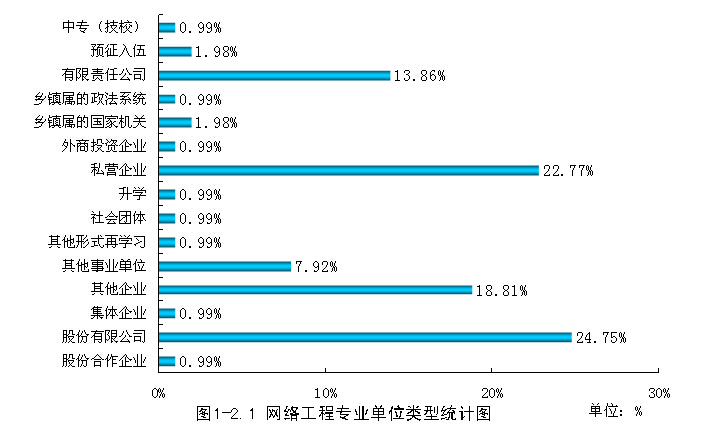 在所属行业中,电信和其他信息传输服务业19人占总就业人数的18.81%、计算机服务业15人占14.85%、商务服务业12人占11.88%,其中与计算机相关的行业电信和其他信息传输服务业、计算机服务业、软件业、专业技术服务业共37人,占总人数的36.63%。