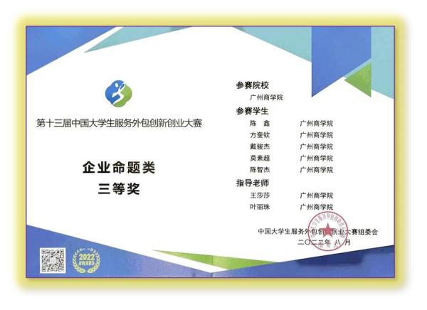 获2022年第十三届中国老员工服务外包创新创业大赛全国三等奖